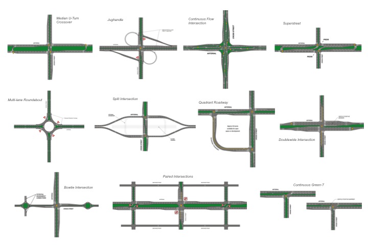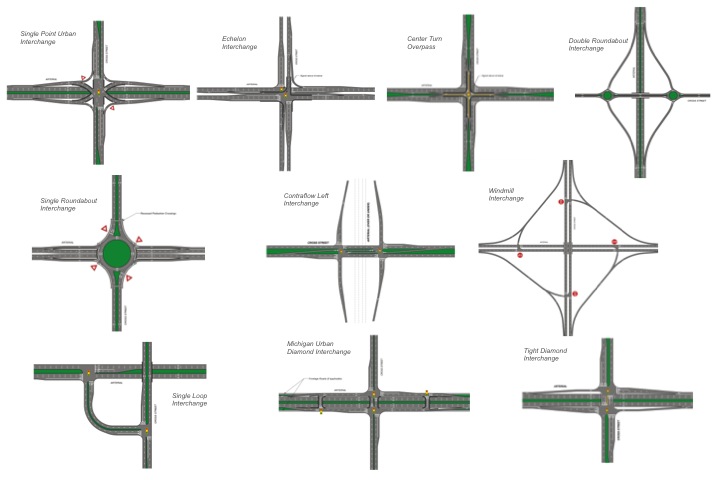 In this webpage, you can find information for nearly all the unconventional intersection/interchange designs. Please select a category or a design at the left side to start.